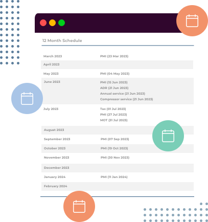 View an instant snapshot of your planned activity across your fleet vehicles, plant equipment and assets - including PMIs, MOTs, ADR, annual service, LOLER, compressor service and many more.